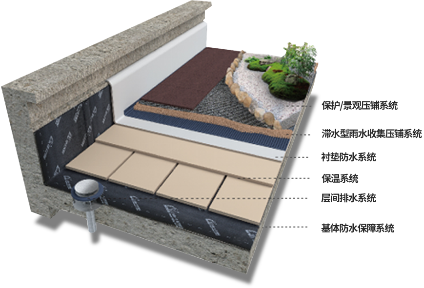 以優異力學性能的高分子防水卷材形成的襯墊防水系統,與基體防水保障系統相配合,對屋面形成多重防水防護。